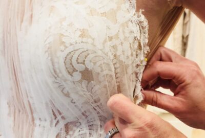 “If I lose or gain weight between now and the wedding, what is your policy for resizing?” It’s natural as it happens all of the time. It’s just a part of the alterations process and falls under the alteration general fees. While major fit adjustments are no problem for our expert team, they may require more complicated processes. For example, releasing a dress a few sizes may require an additional panel to be added, or more in depth work.