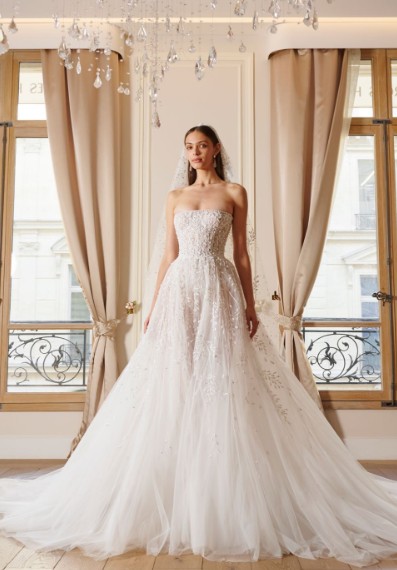 A beautiful strapless tulle dress with an elegant gathered gaudet skirt. Adorned with crystals for a sparkling finish and embroidered with delicate floral detailing.