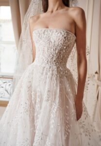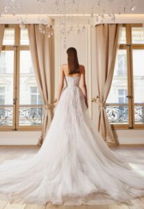 An elegant gown with a long, flowing train that adds drama to every step. The inner long corset provides structure and support, while the nude tone blends harmoniously with the body. A delicate back closure with a unique touch completes the look, along with a detachable bolero and with a matching veil for added versatility.