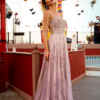 An intricate beaded a-line style gown. It features delicate rhinestone embellished straps, a halter style neckline, and is adorned with a knotted detail.