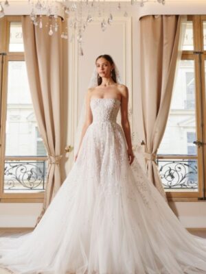 The Maison Georges Hobeika Spring 2025 Bridal Collection seamlessly blends couture artistry with modern elegance, bringing a romantic fairy tale to life. Featuring beaded floral and leaf lace with a scoop neckline, sheer mesh accents, long sleeves, and a sweeping train, the collection is further enhanced by exquisite headpieces with pearl straps and crystalized droplets, adding a touch of ethereal beauty.