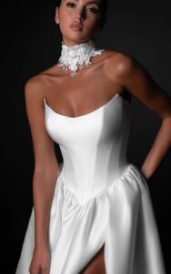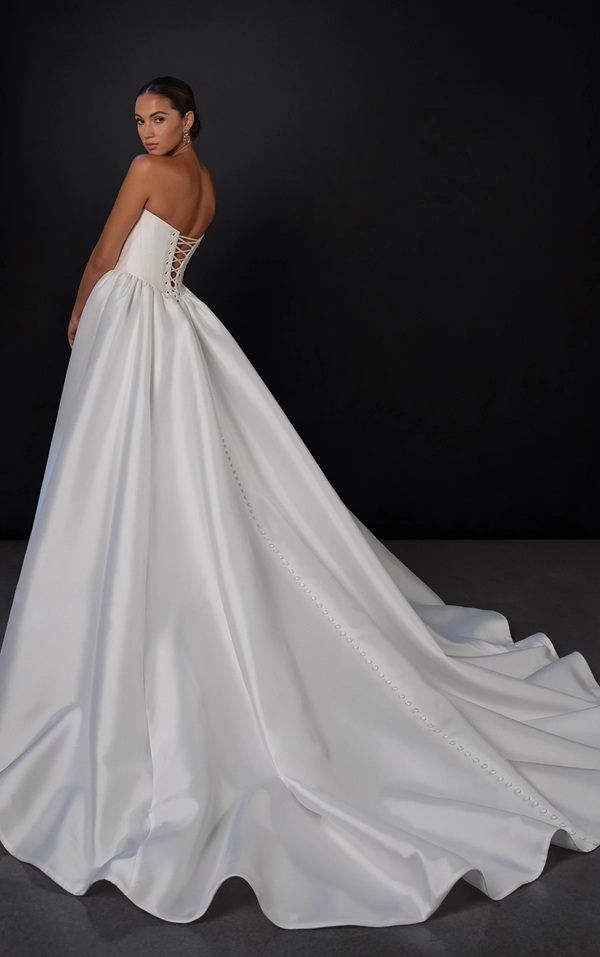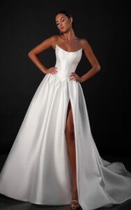 Sleek and timeless, this gown adds classic bridal elegance into a modern masterpiece. The cat-eye neckline adds a bold and fashion-forward twist to the strapless basque waist bodice, sculpting a flattering silhouette with clean structured lines that flow into a voluminous ballgown skirt. The skirt features a high-leg slit for an unexpected touch of contemporary glamour.