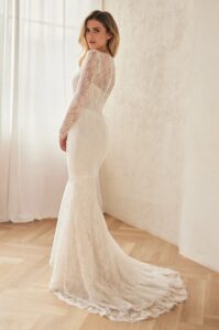 Mermaid fit wedding gown with textured lace appliqué, shimmer sequin layer, plunging v-neckline and cut outs under the arm, creating a flattering silhouette.