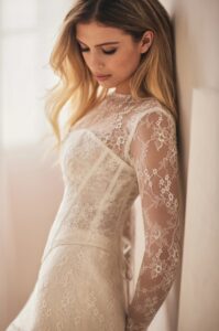 A delicate lace fit and flare gown that features an elegant high neck long sleeve finished with scalloped cuffs. Styled with a detachable sheer lace corset for a more structured, chic fit.