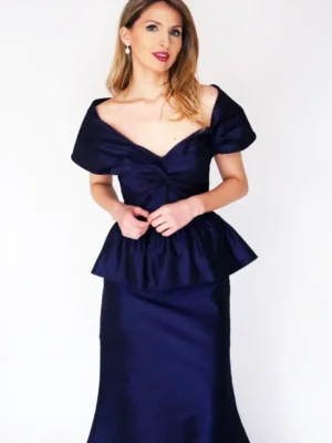 This stunning full-length formal gown is sure to turn heads. Crafted from luxurious mikado woven fabric, it combines elegance and sophistication with every step. The rich texture of the fabric enhances its graceful silhouette, making it the perfect choice for a memorable evening.