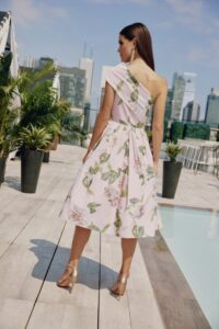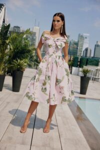 A feminine and romantic tea-length gown designed with an off-shoulder neckline and a fully pleated a-line skirt. Styled with a tied knotted bow detailing along the centerfront bodice.