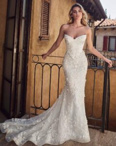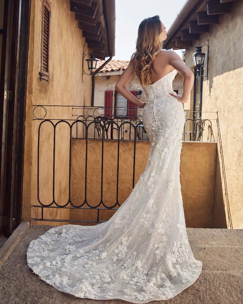 A sculpted basque waistline paired with a figure-hugging sheath silhouette. The gown is adorned with delicate layered 3D florals that extend into a dramatic long train.
