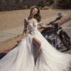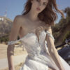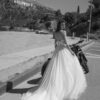 A romantic ballet-inspired gown with a structured long corset and prominent boning that sculpts the body. The diamond neckline adds elegance, while ten godets with layers of tulle create a flowing, airy ballerina effect. The delicate Solstiss lace completes the look with a soft, romantic touch.