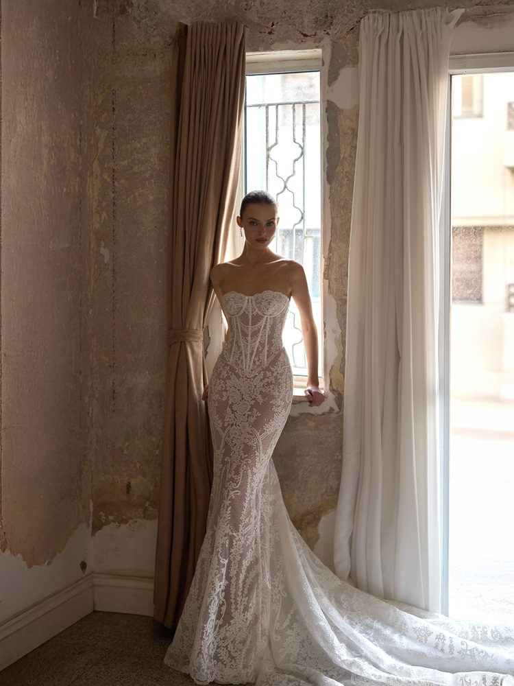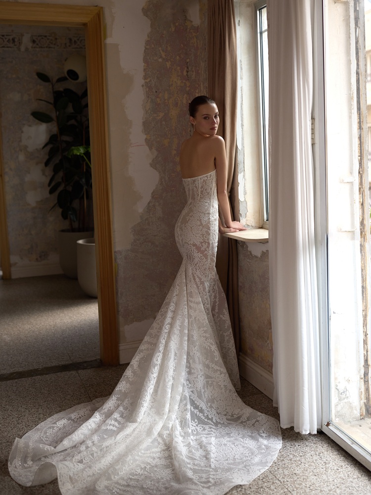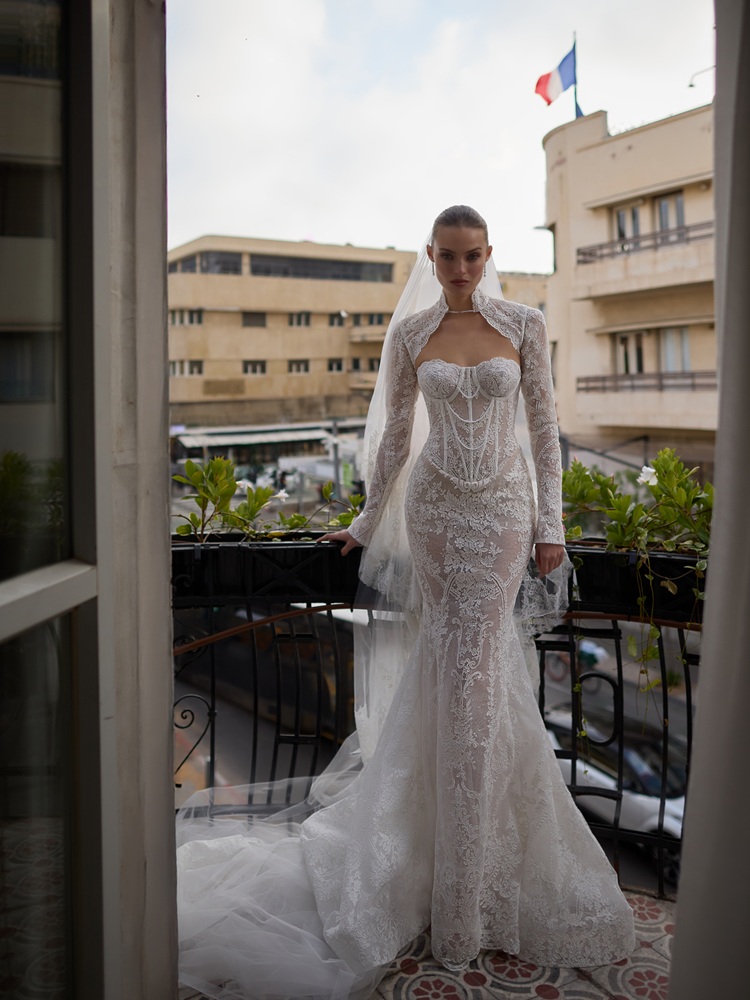 An elegant gown with a long, flowing train that adds drama to every step. The inner long corset provides structure and support, while the nude tone blends harmoniously with the body. A delicate back closure with a unique touch completes the look, along with a detachable bolero and with a matching veil for added versatility.