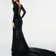 A beautifully crafted fit and flare evening gown that features a soft draped cowl neckline and a classic open back. Adorned with delicate rhinestone detailing along the shoulders.