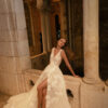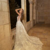 An elegant gown with a long, flowing train that adds drama to every step. The inner long corset provides structure and support, while the nude tone blends harmoniously with the body. A delicate back closure with a unique touch completes the look, along with a detachable bolero and with a matching veil for added versatility.