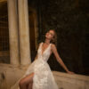 A-line v-neck wedding gown with plunging neckline, sexy slit and delicately beaded floral appliques.