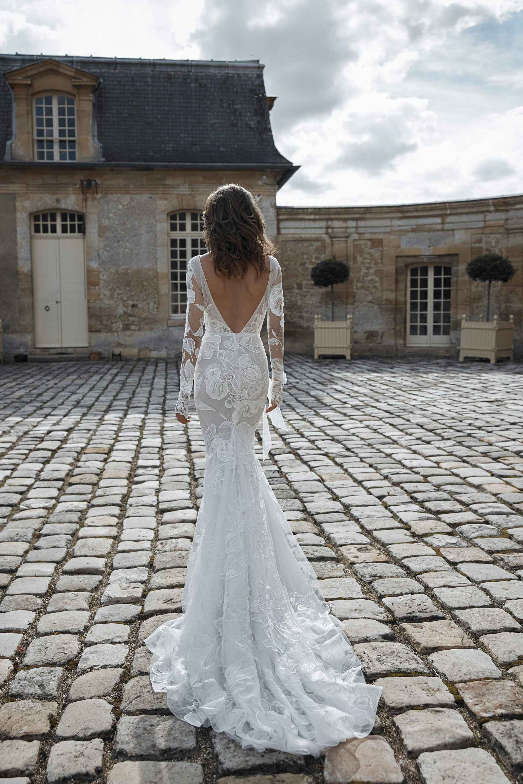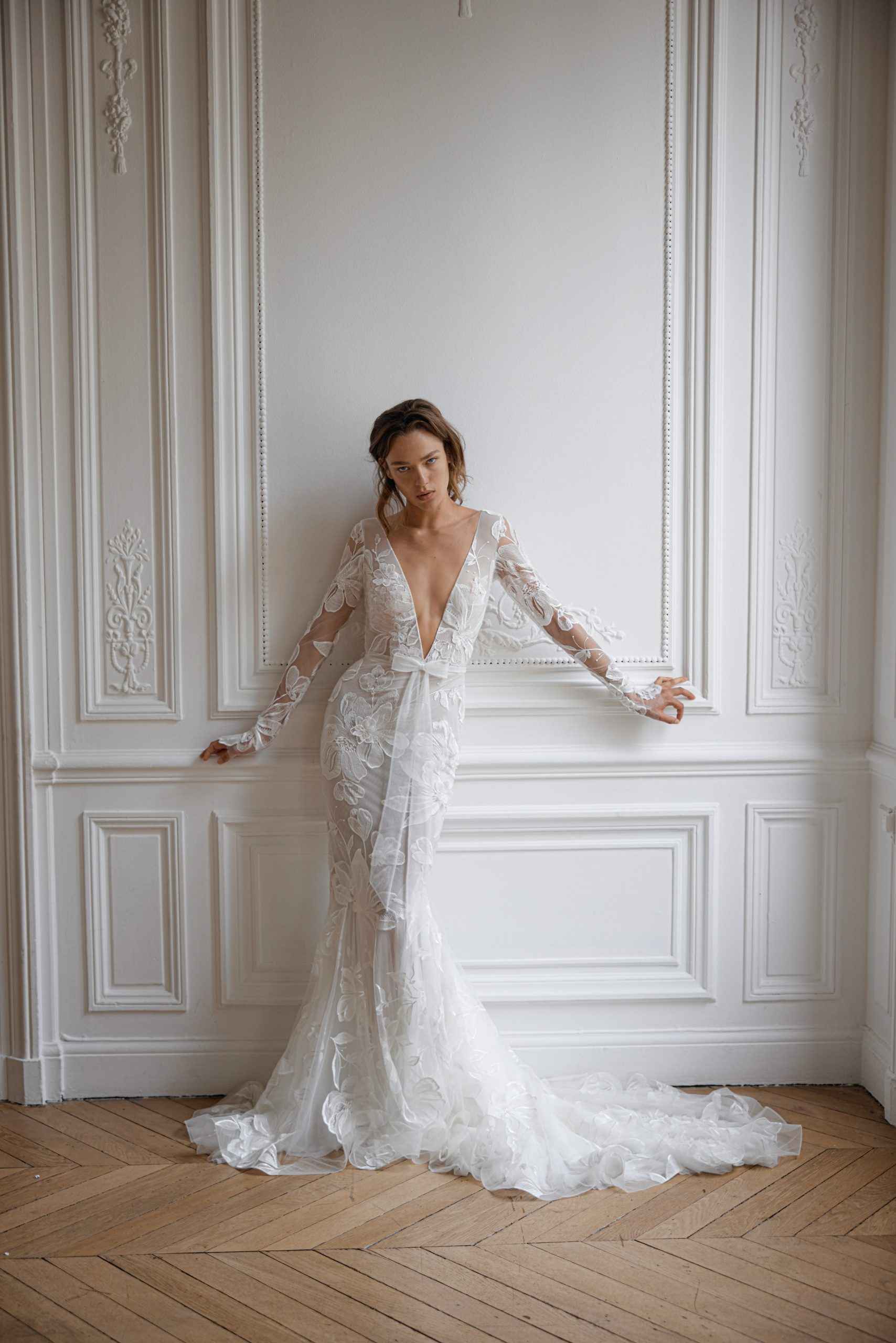 Romantic fit and flare gown adorned with romantic floral lace. Featuring a modern deep-v neckline and a sleek open back.