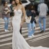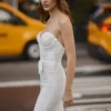 Fit and flare crepe wedding gown with strapless corset style bodice and delicate lace appliques. Waistline adorned with crepe bow.