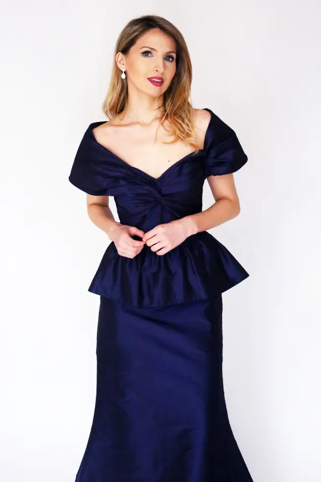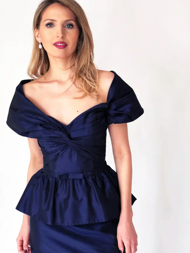 Tags: fit and flare, off-shoulder, peplum, taffeta silk