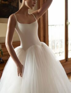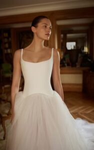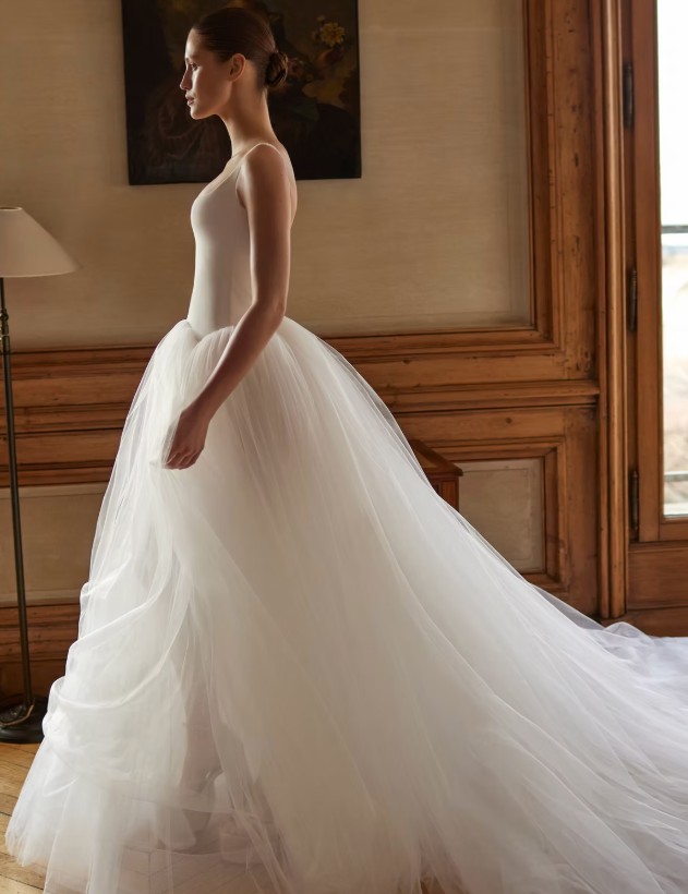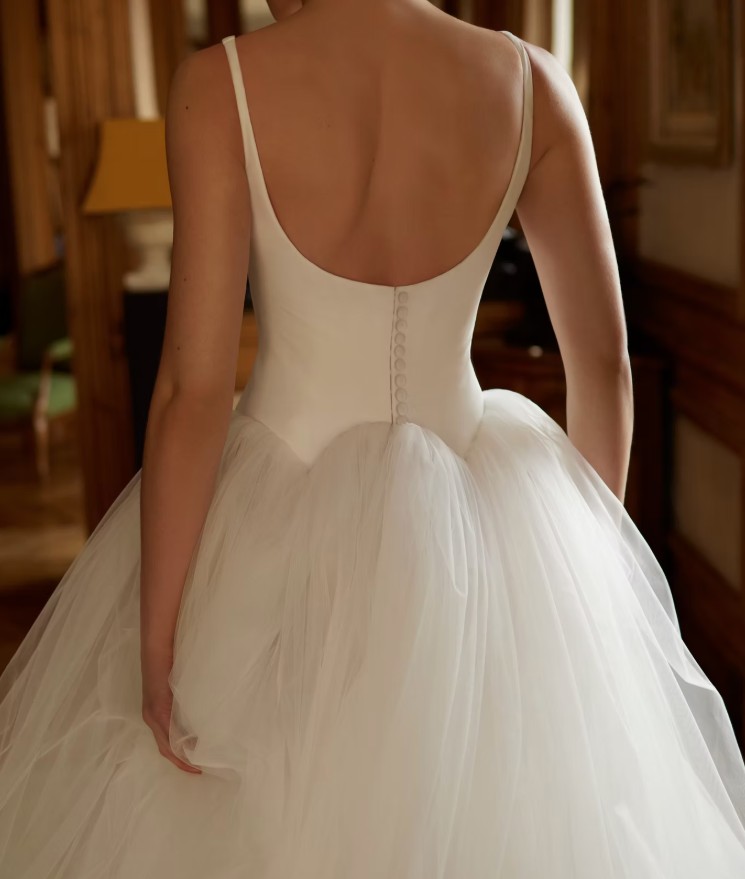 Featuring a sleek crepe bodice with a built-in corset for support and a voluminous tulle skirt to contrast the structure of the bodice. With a long train for added romance, this gown brings a blend of modern flare with timeless elegance.