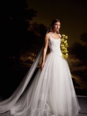 An elegant gown with a long, flowing train that adds drama to every step. The inner long corset provides structure and support, while the nude tone blends harmoniously with the body. A delicate back closure with a unique touch completes the look, along with a detachable bolero and with a matching veil for added versatility.