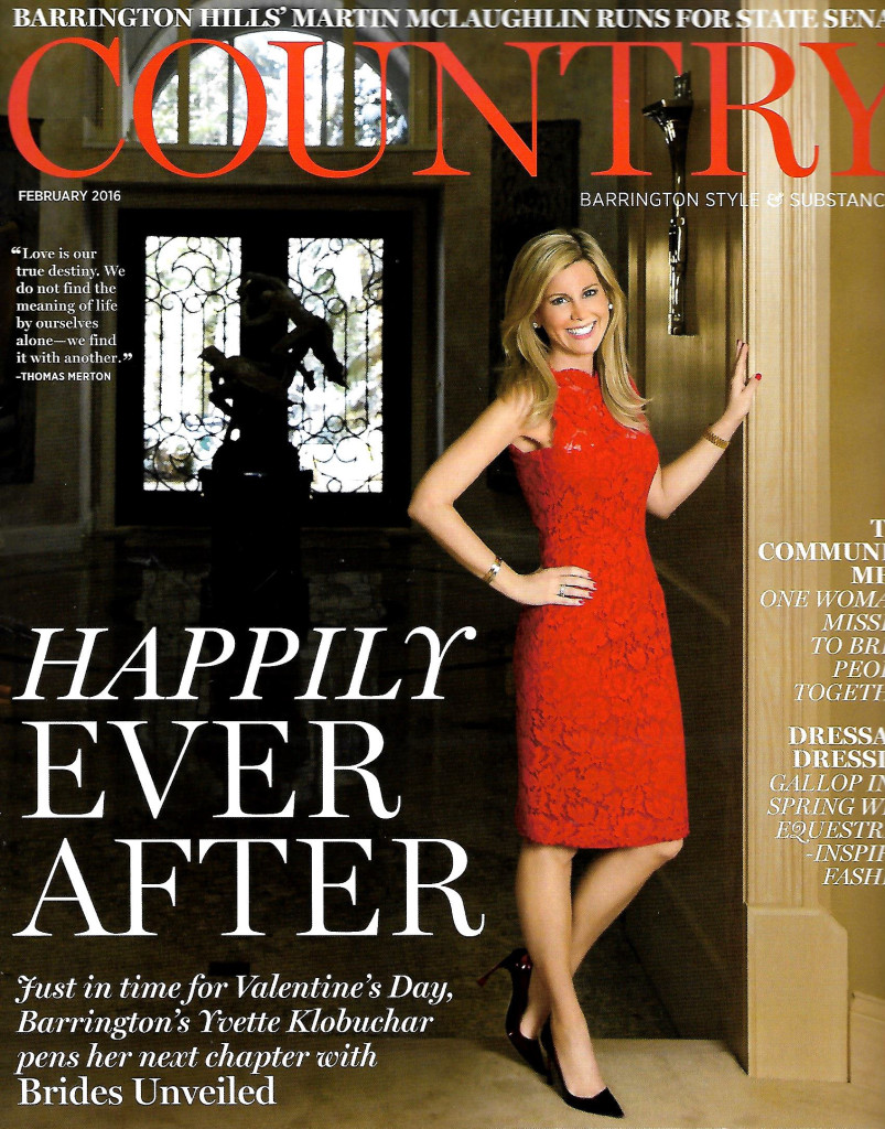 Country Magazine Cover Mira Couture’s own, Yvette Klobuchar, graces the cover of Country Magazine. Read the article featuring her beautiful North Barrington home which talks about the next chapter in her life and her new role as author of the fiction novel, Brides Unveiled. Source: Country-Barrington Style and Substance Issue: February 2016 Featuring: Yvette Klobuchar... Read More
